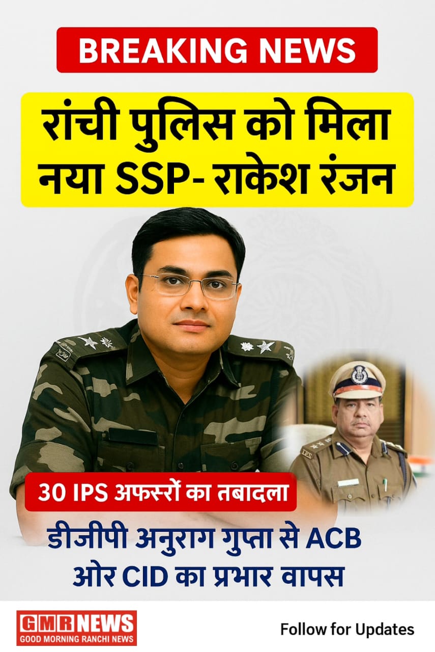 चाईबासा के एसपी राकेश रंजन को रांची का नया वरिष्ठ पुलिस अधीक्षक बनाया गया है।